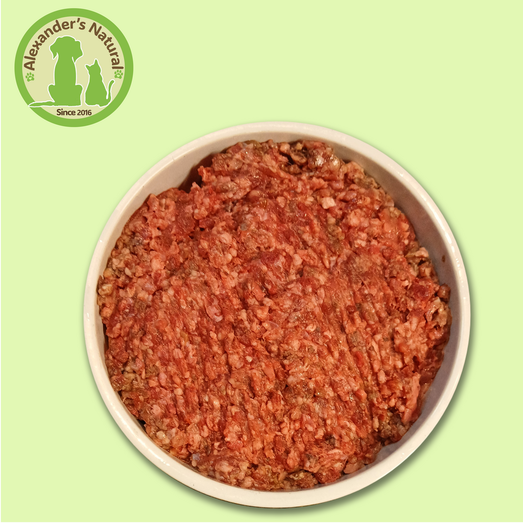 A single protein mince consisting of lean beef trim, green tripe, beef heart and beef liver.
